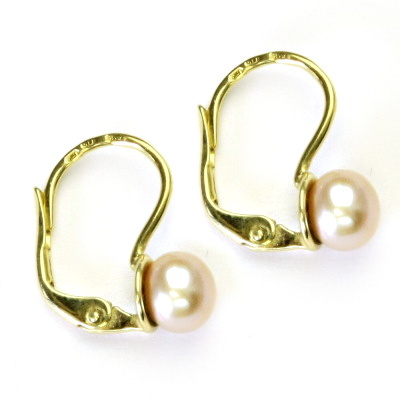 Zlaté náušnice jsou zdobeny růžovou přírodní říční perlou. Průměr perly je 6-6,5 mm. Náušnice jsou ze žlutého zlata a mají zapínání na klapku. Materiál náušnic je zlato 585/1000. Celková výška náušnice je 15 mm. Orientační váha náušnic je cca 2,10 g.&a