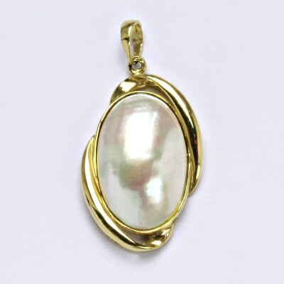 Zlatý přívěšek s přírodní mořskou půlperlou Akoya. Velikost půlperly je 16,5 mm. Délka přívěšku včetně ouška je 28 mm. Materiál je žluté zlato 14 karátů 585/1000.