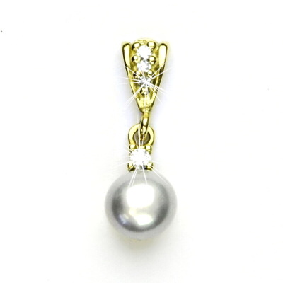 Přívěsek ze žlutého zlata je zdoben čirými zirkony a šedou (stříbrnou) přírodní říční perlou o průměru cca 8 mm. Celková výška přívěsku je 22 mm včetně úchytu. Materiál je zlato 585/1000. Orientační váha přívěsku je 1,73 g.