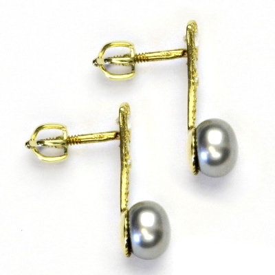 Náušnice ze žlutého zlata jsou zdobeny šedou přírodní říční perlou. Průměr perly je cca 6-6,5mm. Náušnice mají zapínání na šroubek. Celková výška náušnice je 17,5 mm. Materiál je zlato 585/1000. Orientační váha náušnic je cca 2,02 g.