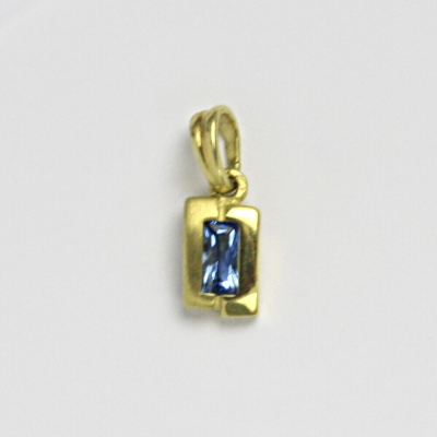 Přívěsek ze žlutého zlata s akvamarínem syntetickým, celková výška přívěsku včetně ouška je 15 mm. Meteriál je žluté zlato 585/1000