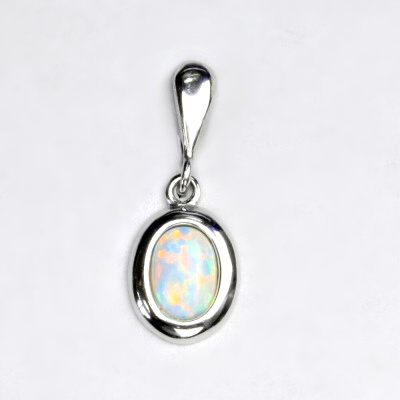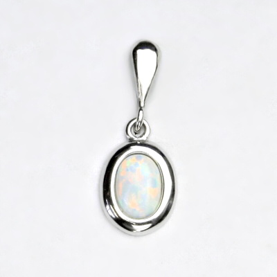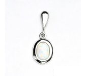 Přívěsek z bílého zlata je zdoben bílým syntetickým opálem o rozměru 7x5 mm. Materiál je zlato 585/100. Orientační váha přívšeku je 1,30 g. Rozměr přívěsku je 22 mm včetně úchytu na výšku a 8 mm na šířku.