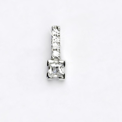 Přívěsek z bílého zlata je zdoben čirými zirkony. Materiál je zlato 585/1000. Orientační váha přívěsku je 0,82 g. Rozměr přívěsku je 12 mm včetně úchytu na výšku a 4,5 mm na šířku.
