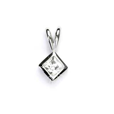 Přívěsek z bílého zlata je zdoben čirým zirkonem o rozměru 4x4 mm. Materiál je zlato 585/1000. Orientační váha přívěsku je 1,08 g. Rozměr přívěsku je 14 mm včetně úchytu na výšku a 8 mm na šířku.