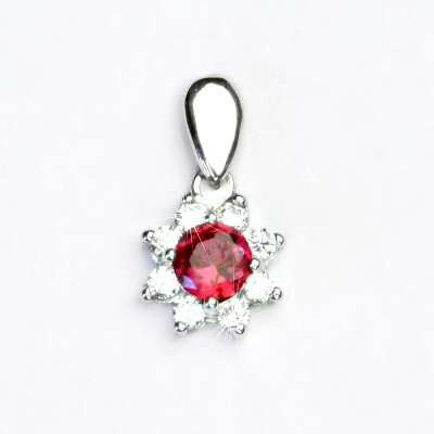 Přívěsek z bílého zlata s čirými zirkony a zirkonem v barvě rubínu o průměru 5,5 mm - kytička. Materiál je zlato 585/1000. Orientační váha přívěsku je 1,59 g. Rozměr přívěsku je 18 mm včetně úchytu na výšku a 10 mm na šířku.