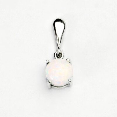 Přívěsek z bílého zlata je zdoben bílým syntetickým opálem o průměru 7 mm. Materiál je stříbro 925/1000. Orientační váha náušnic je 1,29 g. Rozměr přívěsku je 19 mm včetně očka na výšku a 7 mm na šířku.
