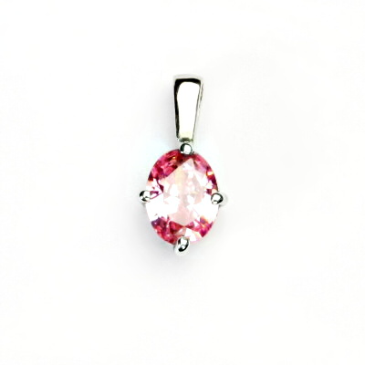 Přívěsek z bílého zlata s růžovým zirkonem o rozměru 8x6 mm. Materiál je zlato 585/1000. Orientační váha přívěsku je 1,41 g. Rozměr přívěsku je 6 mm včetně úchytu na výšku a 8 mm na šířku.