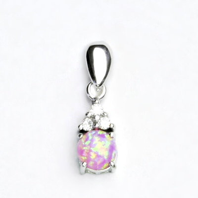 Přívěsek z bílého zlata s čirými zirkony a růžovým syntetickým opálem o průměru 6 mm. Materiál je zlato 585/1000. Orientační váha přívěsku je 1,56 g. Rozměr přívěsku je 20 mm včetně úchytu na výšku a 6 mm na šířku.