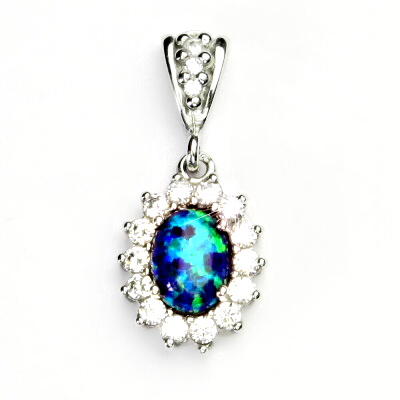 Přívěsek z bílého zlata je zdoben čirými zirkony a syntetickým tmavě zeleným opálem o rozměru 8x6 mm. Materiál je zlato 585/1000. Rozměr přívěsku je 24 mm včetně očka na výšku a 11 mm na šířku. Orientační váha přívěsku 2,10 g.