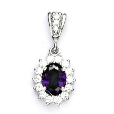 Přívěsek z bílého zlata je zdoben čirými zirkony a zirkonem v barvě ametystu o rozměru 8x6 mm. Materiál je zlato 585/1000. Rozměr přívěsku je 24 mm včetně očka na výšku a 11 mm na šířku. Orientační váha přívěsku 2,10 g.