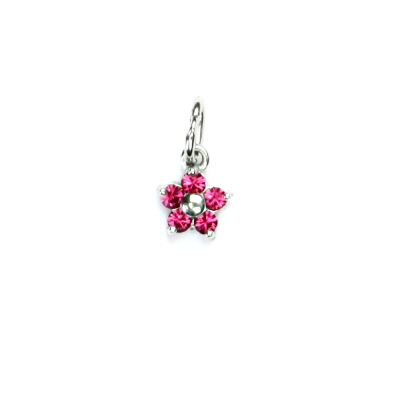 Přívěsek z bílého zlata má tvar kytičky a je zdoben Swarovski krystaly fuchsia. Materiál je zlato 585/1000. Přívěsek má povrchovou úpravu čisté rhodium. Rozměr přívěsku je 10 mm včetně očka na výšku a 6 mm na šířku.