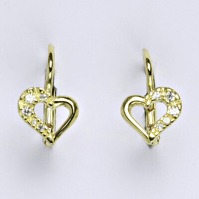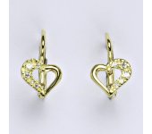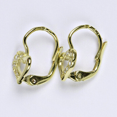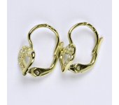 Zlaté náušnice s čirými zirkony se zapínáním na patent. Celková výška náušnic je 17 mm. Orientační váha přívěsku 1,77 g. Materiál je žluté zlato čtrnáct karátů 585/1000.