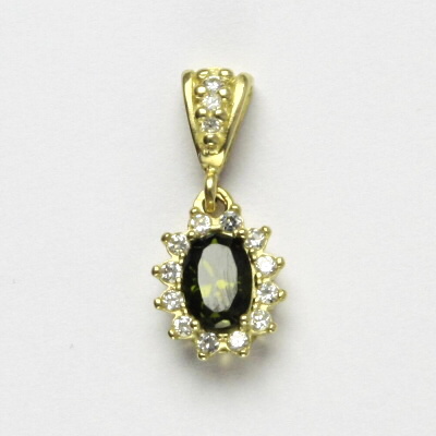 Přívěsek je vyroben ze žlutého zlata. Je zdoben syntetickým olivínem o rozměru 7x5 mm a malými čirými zirkony. Materiál je zlato 585/1000. Orientační váha přívěsku je 1,85 g