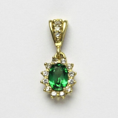 Přívěsek je vyroben ze žlutého zlata. Je zdoben zirkonem - emerald o rozměru 7x5 mm a malými čirými zirkony. Materiál je zlato 585/1000. Orientační váha přívěsku je 1,85 g