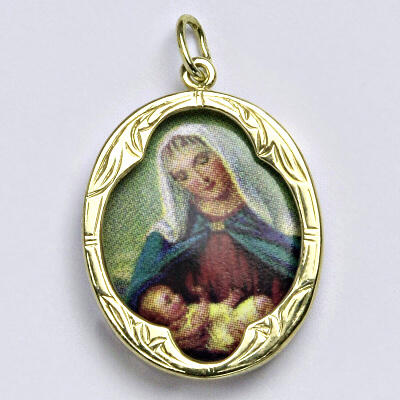 Zlatý přívěsek madonka ze žlutého zlata. Medajlón madonka 29 mm i s ouškem. Orientační váha přívěsku je 3,22 g. Materiál je žluté zlato 14 karátů 585/1000.