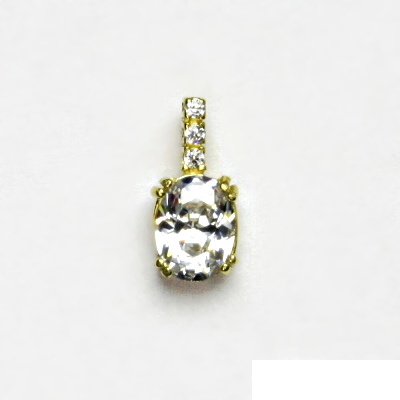 Přívěsek ze žlutého zlata je zdoben čirými zirkony. Rozměr největšího zirkonu je 8x6 mm. Materiál je zlato 585/1000. Rozměr přívěsku je 13 mm včetně očka na výšku a 6 mm na šířku. Orientační váha přívěsku je 1,31 g.
