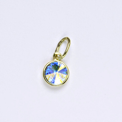 Zlatý přívěsek se Swarovski krystalem. Průměr Swarovski krystalu je 5 mm. Celková výška přívěsku i se závěsem je 13 mm. Přívesek je ze žlutého čtrnácti karátového zlata 585/1000. Orientační váha je 0,45 g.
