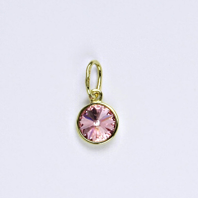 Zlatý přívěsek se Swarovski krystalem. Průměr Swarovski krystalu je 5 mm. Celková výška přívěsku i se závěsem je 13 mm. Přívesek je ze žlutého čtrnácti karátového zlata 585/1000. Orientační váha je 0,45 g.