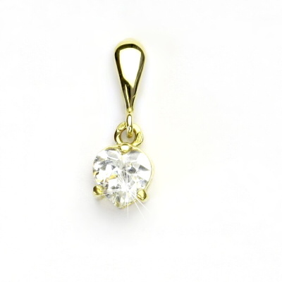 Přívěsek ze žlutého zlata s čirým zirkonem ve tvaru srdíčka o rozměru 6x6 mm.. Materiál je zlato 585/1000. Orientační váha přívěsku je 1,13 g. Rozměr přívěsku je 18 mm a 6 mm na šířku.