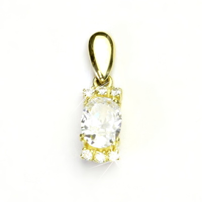 Přívěsek ze žlutého zlata je zdoben čirými zirkony. Materiál je zlato 585/1000. Orientační váha přívěsku je 1,6 g. Rozměr přívěsku je 20 mm včetně úchytu na výšku a 6 mm na šířku. Použité čiré zirony: 8 x 6 mm 1 ks a 1,5 mm 6 ks.