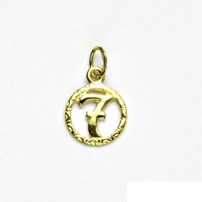 Přívěsek ze žlutého zlata - sedmička v kroužku. Materiál je zlato 585/1000. Rozměr přívěsku je 15 mm včetně očka na výšku a 9 mm na šířku. Orientační váha přívěsku je 0,44 g.