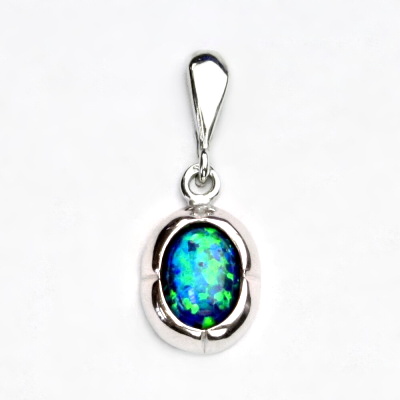 Přívěsek z bílého zlata je zdoben zeleným syntetickým opálem o rozměru 8x 6mm. Materiál je zlato 585/1000. Orientační váha je 1,8 g. Rozměr přívěsku je 22 mm včetně úchytu na výšku a 9 mm na šířku.