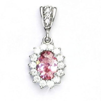 Přívěsek z bílého zlata je zdoben čirými zirkony a růžovým zirkonem o rozměru 8x6 mm. Materiál je zlato 585/1000. Rozměr přívěsku je 24 mm včetně očka na výšku a 11 mm na šířku. Orientační váha přívěsku 2,10 g.