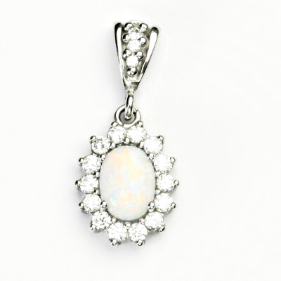 Přívěsek z bílého zlata je zdoben čirými zirkony a syntetickým bílým opálem o rozměru 8x6 mm. Materiál je zlato 585/1000. Rozměr přívěsku je 24 mm včetně očka na výšku a 11 mm na šířku. Orientační váha přívěsku 2,10 g.