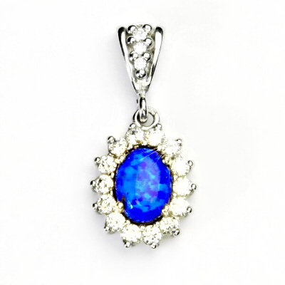 Přívěsek z bílého zlata je zdoben čirými zirkony a syntetickým tmavě modrým opálem o rozměru 8x6 mm. Materiál je zlato 585/1000. Rozměr přívěsku je 24 mm včetně očka na výšku a 11 mm na šířku. Orientační váha přívěsku 2,10 g.