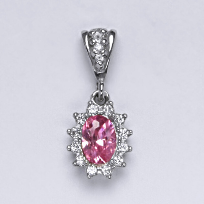 Zlatý přívěšek je zdoben růžovým zirkonem o velikosti 7x5 mm a malými čirými zirkony. Materiál je bílé zlato 585/1000. Celková výška přívěšku je 22 mm. Orientační váha přívěsku je 1,85 g.