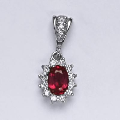 Zlatý přívěšek je zdoben syntetickým rubínem o velikosti 7x5 mm a malými čirými zirkony. Materiál je bílé zlato 585/1000. Celková výška přívěšku je 22 mm. Orientační váha přívěsku je 1,85 g.
