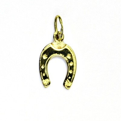Přívěsek ze žlutého zlata ve tvaru podkovy. Materiál je zlato 585/1000. Orientační váha přívěsku je 0,75 g. Rozměr přívěsku je 18 mm včetně očka na výšku a 9 mm na šířku.