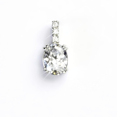 Přívěsek z bílého zlata je zdoben čirými zirkony. Rozměr největšího zirkonu je 8x6 mm. Materiál je zlato 585/1000. Rozměr přívěsku je 13 mm včetně očka na výšku a 6 mm na šířku. Orientační váha přívěsku je 1,31 g.