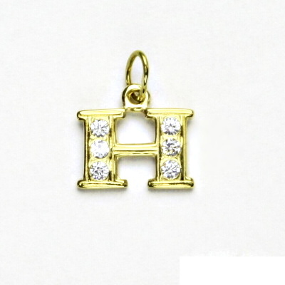 Zlatý přívěsek písmenko H je zdobeno čirými zirkony. Materiál je zlato 585/1000. Rozměr přívěsku je 16 mm včetně očka a 13 mm na šířku. Orientační váha přívěsku je 1,15 g.