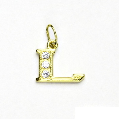 Zlatý přívěsek písmenko L je zdobeno čirými zirkony. Materiál je zlato 585/1000. Rozměr přívěsku je 15 mm včetně očka a 13 mm na šířku. Orientační váha přívěsku je 0,84 g.