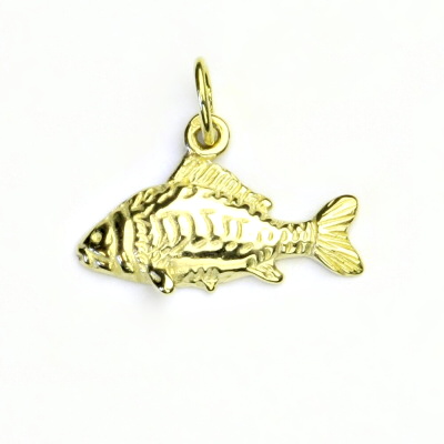 Přívěsek ze žlutého zlata ve tvaru kapra. Materiál je zlato 585/1000. Orientační váha přívěsku je 1,21 g. Rozměr přívěsku je 15 mm včetně očka na výšku a 18 mm na šířku.
