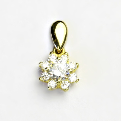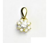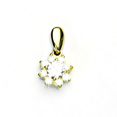 Přívěsek ze žlutého zlata s čirými zirkony - kytička. Materiál je zlato 585/1000. Orientační váha přívěsku je 1,59 g. Rozměr přívěsku je 18 mm včetně úchytu na výšku a 10 mm na šířku.