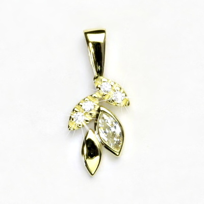 Přívěsek ze žlutého zlata s čirými zirkony - největší 6x3 mm.. Materiál je zlato 585/1000. Orientační váha přívěsku je 1,22 g. Rozměr přívěsku je 21 mm včetně úchytu na výšku a 9 mm na šířku.