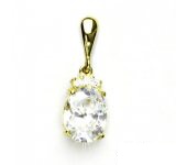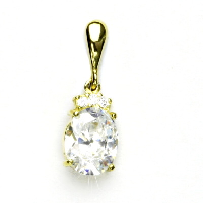 Přívěsek ze žlutého zlata je zdoben čirými zirkony. Rozměr největšího zirkonu je je 10x8 mm. Materiál je zlato 585/1000. Rozměr přívěsku je 26 mm včetně úchytu na výšku a 9 mm na šířku. Orientační váha přívěsku je cca 1,93 g.