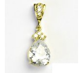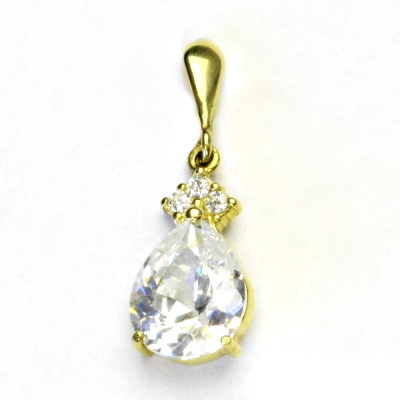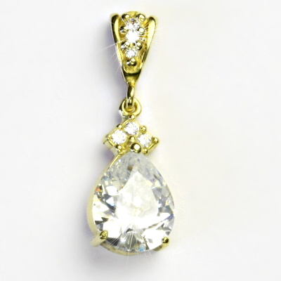 Přívěsek ze žlutého zlata je zdoben čirými zirkony. Rozměr největšího zirkonu ve tvaru slzy je 11 x 9 mm. Materiál je zlato 585/1000. Rozměr přívěsku je 26 mm včetně úchytu na výšku a 9 mm na šířku. Orientační váha přívěsku je cca 2,43 g.