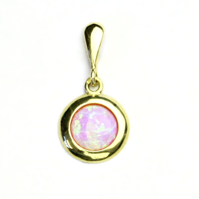 Přívěsek ze žlutého zlata je zdoben růžovým syntetickým opálem o průměru 8 mm. Materiál je zlato 585/1000. Orientační váha přívěsku je 1,37 g. Rozměr přívěsku je 20 mm včetně očka na výšku a 11 mm na šířku.