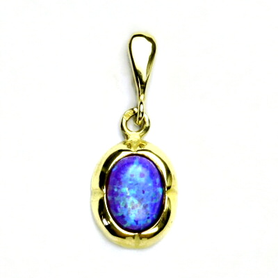 Přívěsek ze žlutého zlata je zdoben fialovým syntetickým opálem o rozměru 8x 6mm. Materiál je zlato 585/1000. Orientační váha je 1,80 g. Rozměr přívěsku je 22 mm včetně úchytu na výšku a 9 mm na šířku.