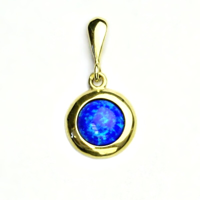 Přívěsek ze žlutého zlata je zdoben tmavě modrým syntetickým opálem o průměru 8 mm. Materiál je zlato 585/1000. Orientační váha přívěsku je 1,37 g. Rozměr přívěsku je 20 mm včetně očka na výšku a 11 mm na šířku.