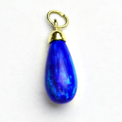 Přívěsek ze žlutého zlata je zdoben syntetickým tmavě modrým opálem o rozměru 18x14 mm. Materiál je zlato 585/1000. Orientační váha přívěsku je 1,43 g. Rozměr přívěsku je 26 mm včetně očka na výšku.