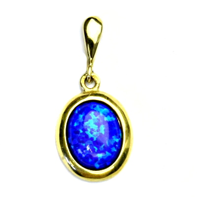 Přívěsek ze žutého zlata je zdoben tmavě modrým syntetickým opálem 10x8 mm. Materiál je zlato 585/1000. Orientační váha přívěsku je 1,90 g. Rozměr přívěsku je 24 mm včetně úchytu na výšku a 11 mm na šířku.