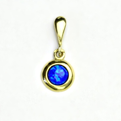 Přívěsek ze žlutého zlata je zdoben tmavě modrým syntetickým opálem o průměru 5 mm. Materiál je zlato 585/1000. Orientační váha přívěsku je 0,93 g. Rozměr přívěsku je 19 mm včetně úchytu na výšku a 8 mm na šířku.
