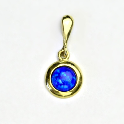Přívěsek ze žlutého zlata je zdoben tmavě modrým syntetickým opálem o průměru 6 mm. Materiál je zlato 585/1000. Orientační váha přívěsku je 1,05 g. Rozměr přívěsku je 20 mm včetně úchytu na výšku a 9 mm na šířku.