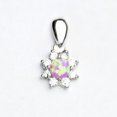 Přívěsek z bílého zlata s čirými zirkony a syntetickým růžovým opálem 5,5 mm - kytička. Materiál je zlato 585/1000. Orientační váha přívěsku je 1,59 g. Rozměr přívěsku je 18 mm včetně úchytu na výšku a 10 mm na šířku.