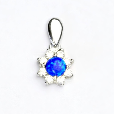 Přívěsek z bílého zlata s čirými zirkony a syntetickým tmavě modrým opálem 5,5 mm - kytička. Materiál je zlato 585/1000. Orientační váha přívěsku je 1,59 g. Rozměr přívěsku je 18 mm včetně úchytu na výšku a 10 mm na šířku.