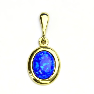 Přívěsek ze žlutého zlata je zdoben tmavě modrým syntetickým opálem o roměru 9x7 mm. Materiál je zlato 585/1000. Orientační váha přívěsku je 1,76 g. Rozměr přívěsku je 22 mm včetně očka na výšku a 10 mm na šířku.